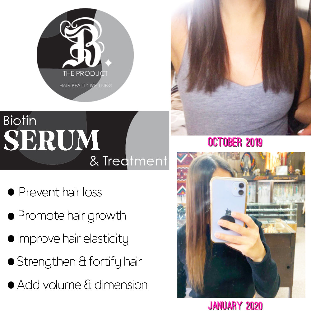 To use as a treatment, apply to the hair after you wash and condition it with our Biotin shampoo & conditioner. Start with a dime size and apply from roots to ends and comb through for full saturation. Add more depending on the thickness of your hair. Leave in for 15-20 minutes. It can be used with a plastic bag, or under a dryer for more conditioning. To use as a styling serum, when the hair is wet, apply a dime-size from roots to ends, then blow-dry and style as desired. This product will protect your hair from hot tools. B. The Product Biotin treatment is for all hair types. Grow longer, stronger, thicker hair with B. The Product's protecting serum keeps damage away by being heat resistant when straightening. This hair adds volume and thickness to thin, brittle hair that never grows to the length you've always desired and makes it feel like silk. Strengthens the roots internally to create fullness to the base of the hair shaft. For color-treated hair, it helps close and protect the hair shaft from hair color and chemical straighteners. Seals the cuticle for stronger, shinier hair and prevents hair color from fading. Medium to thick hair. Creates body and movement to medium and thick hair while keeping straight. Hair will appear longer and fuller in a shorter amount of time than normal. Biotin shampoo will not make hair grow faster in unwanted areas.